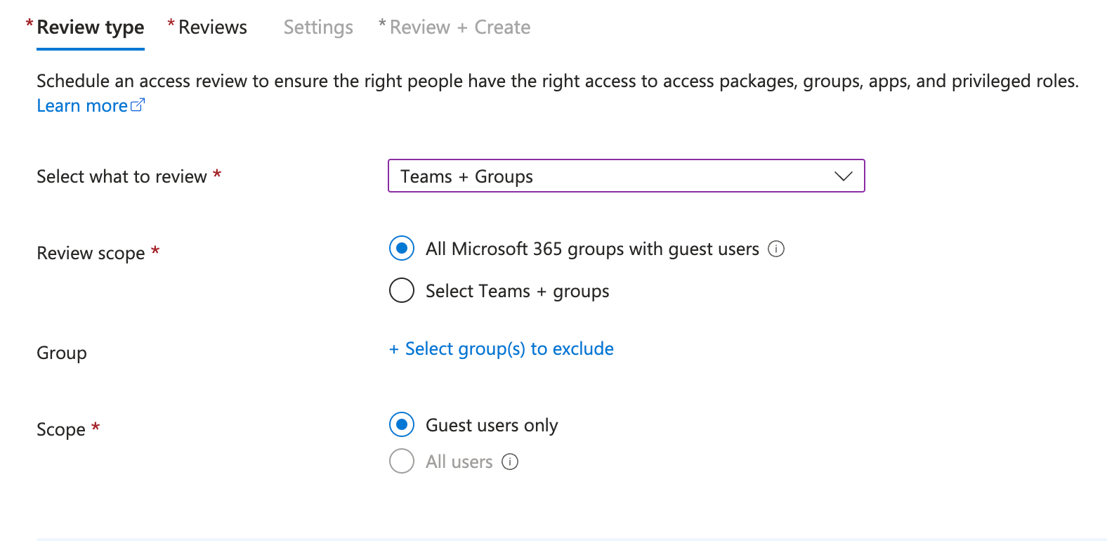 Create a New Access Review: Specify the scope of the review, whether it’s targeted at guest users across all Microsoft Teams and Groups or specific ones.