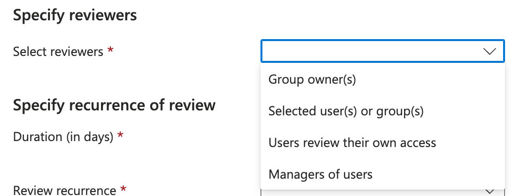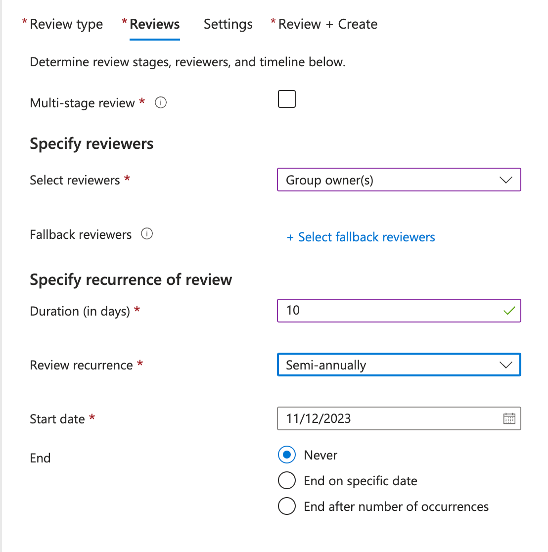 Define Review Settings: Choose who will perform the review (group owners, specific users, or application owners), set the frequency (one-time or recurring), and establish the start and end dates.