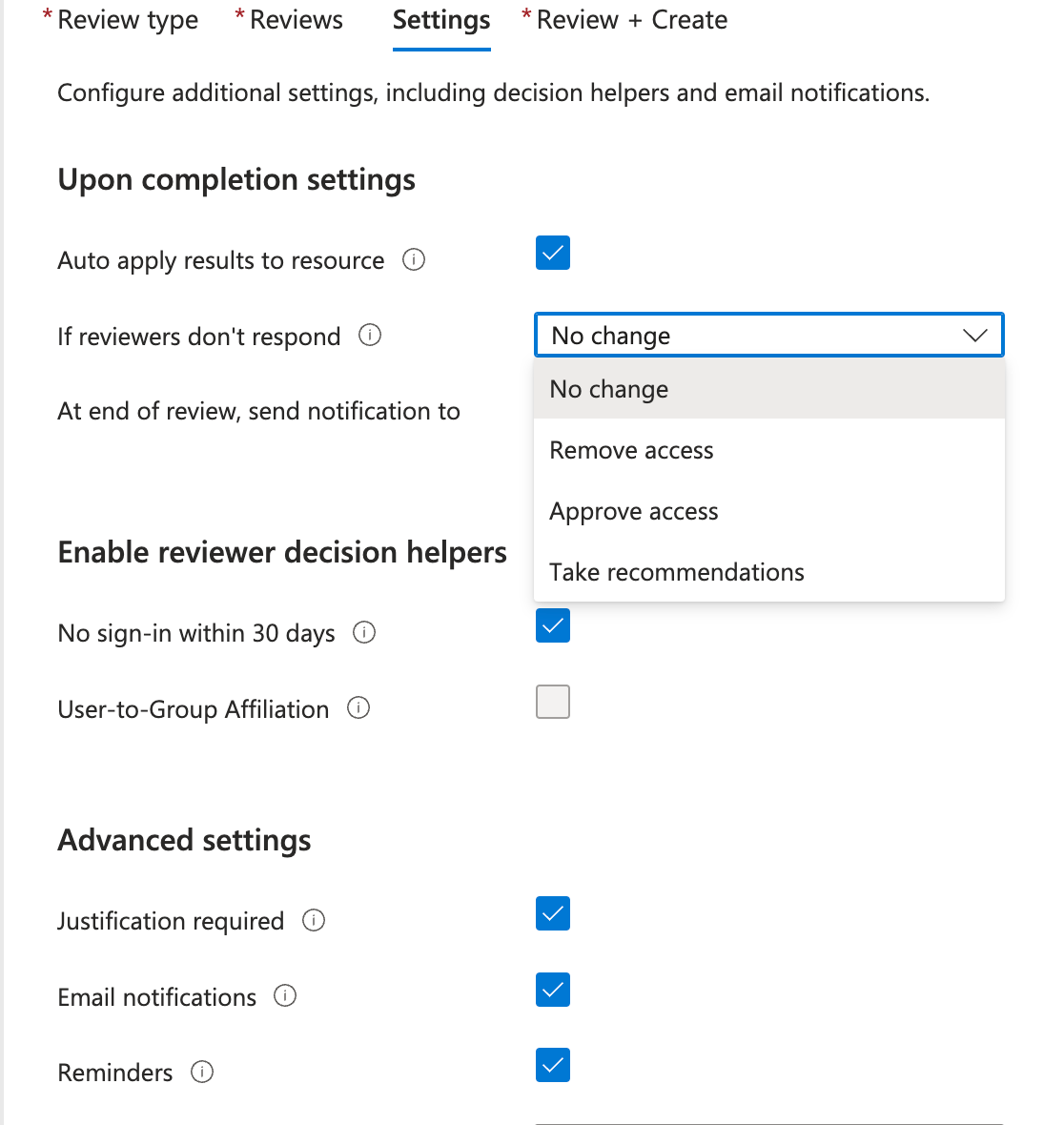 Customize Review Settings: Decide on the outcomes for denied access, such as automatic removal or a manual step, and whether reviewers receive reminders.