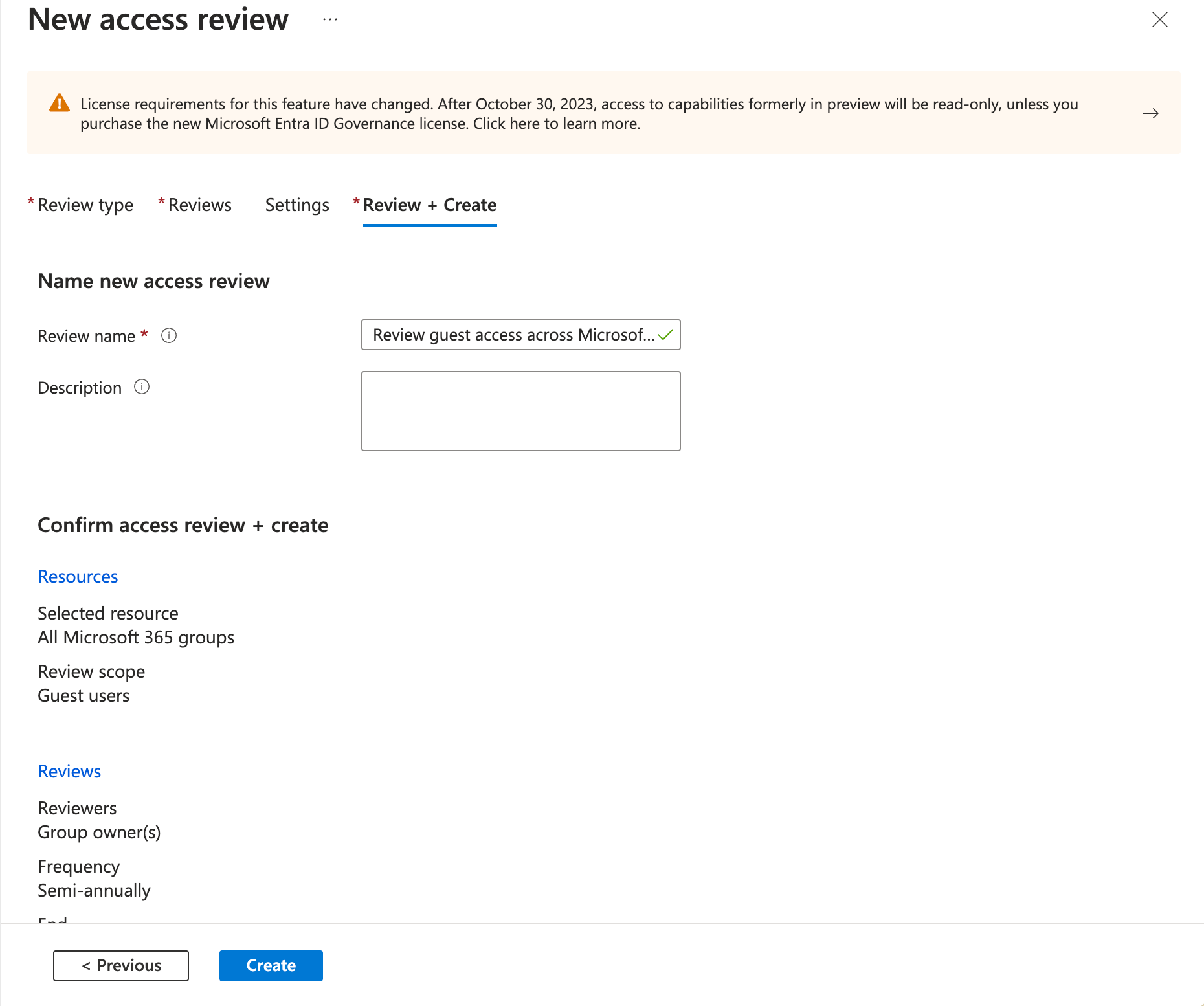 Review and Confirm: Double-check the settings, and then create the access review.
