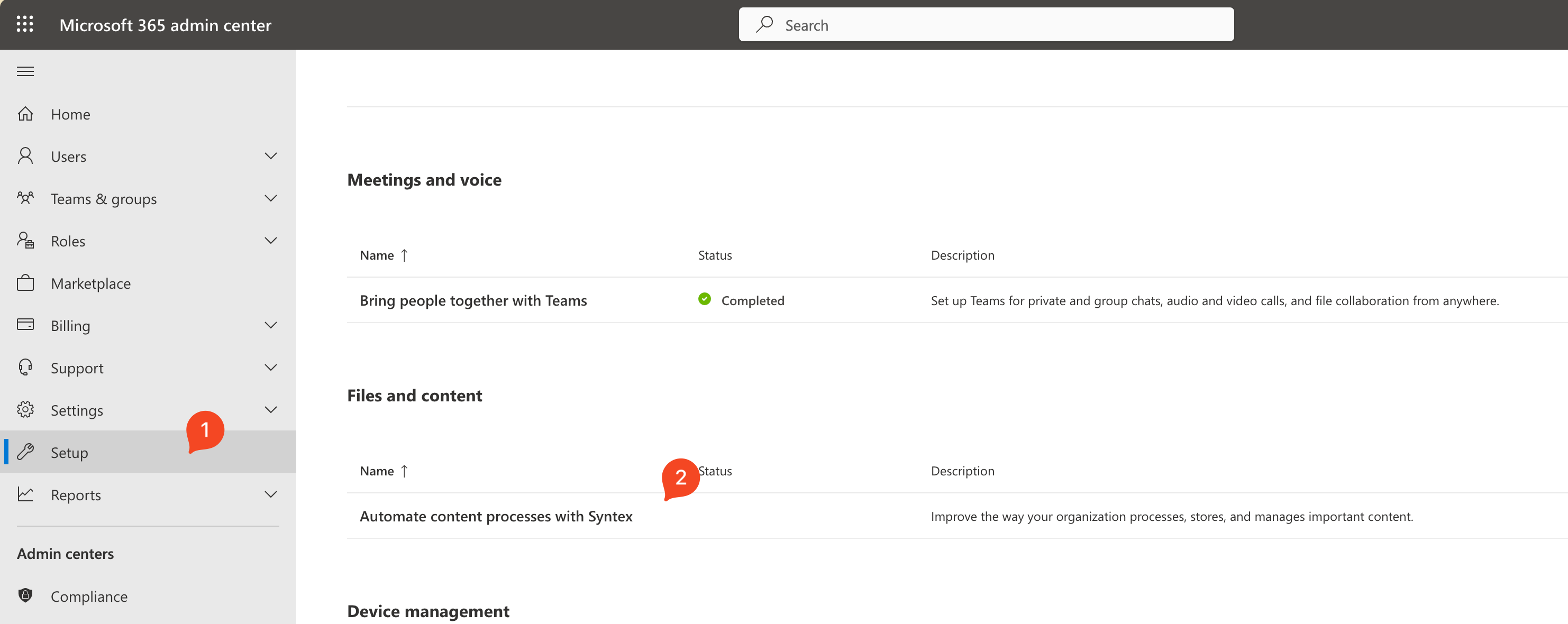Access the Admin Center: Log into the Microsoft 365 admin center and navigate to Setup > Files and content > Automate content processes with Syntex.