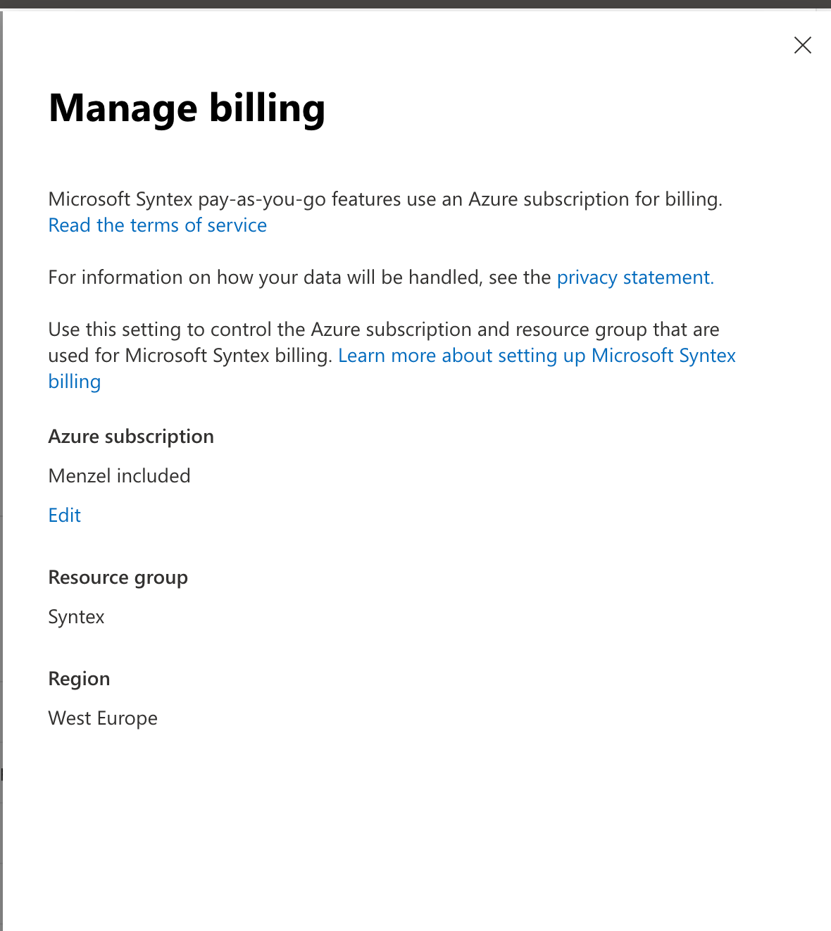 Set Up Azure billing: You’ll need to set up Azure billing to use Syntex. If you haven’t already done this, follow Manage pay-as-you-go billing. There you have to fill in an azure subscription, a resource group, and a region. This is where the costs for the AI processing will be billed.