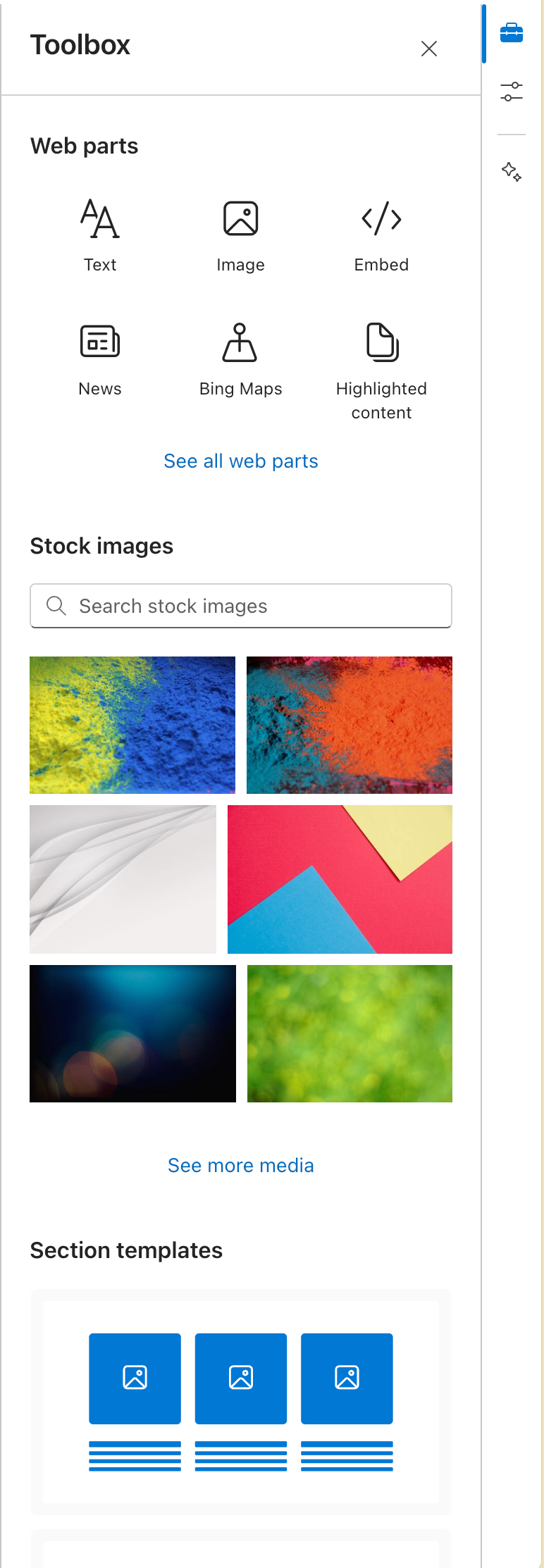 The Toolbox is a brand new addition to the SharePoint page authoring experience, and it’s a real game-changer. Here, you’ll find everything you need to create a stunning page, including: