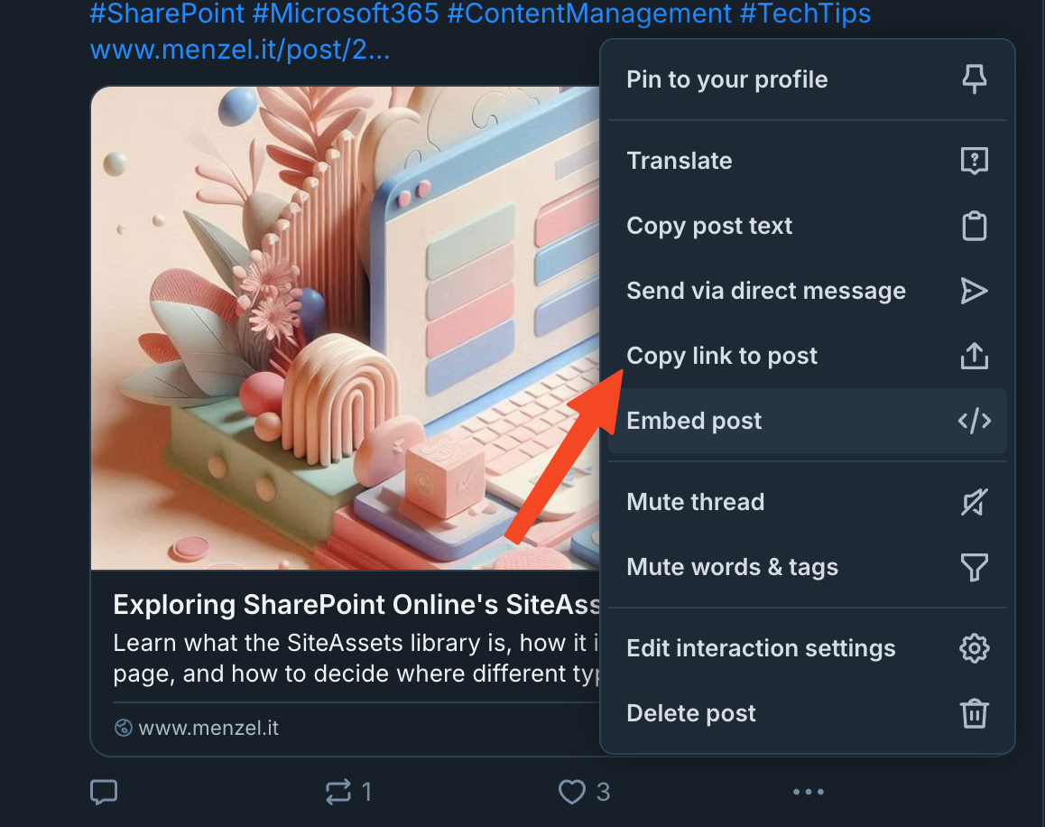 There you need to copy the post ID and paste it into the Front Matter section of your article. https://bsky.app/profile/ollim365.menzel.it/post/3laoyekihlo2j