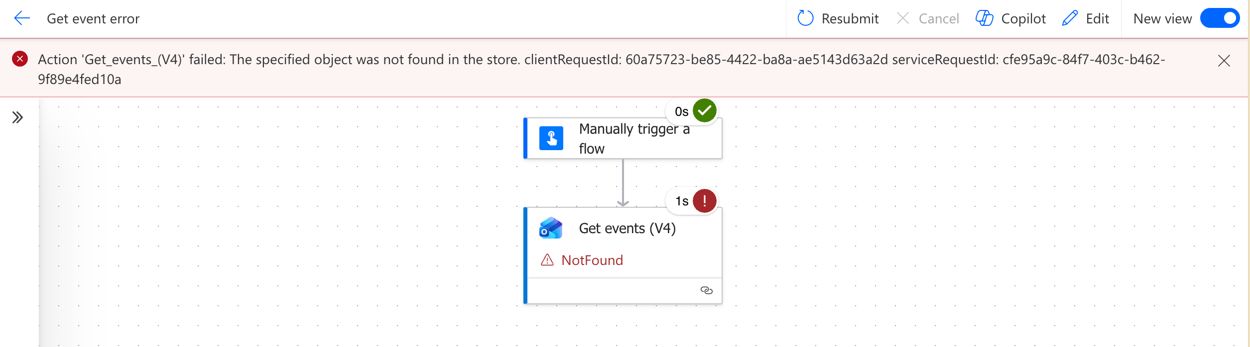 Action 'Get_events_(V4)' failed: The specified object was not found in the store. clientRequestId: 419cc2c9-c19a-411c-a132-4605f06bdbc9 serviceRequestId: 4d334b19-f230-4361-861a-d532c101f255
